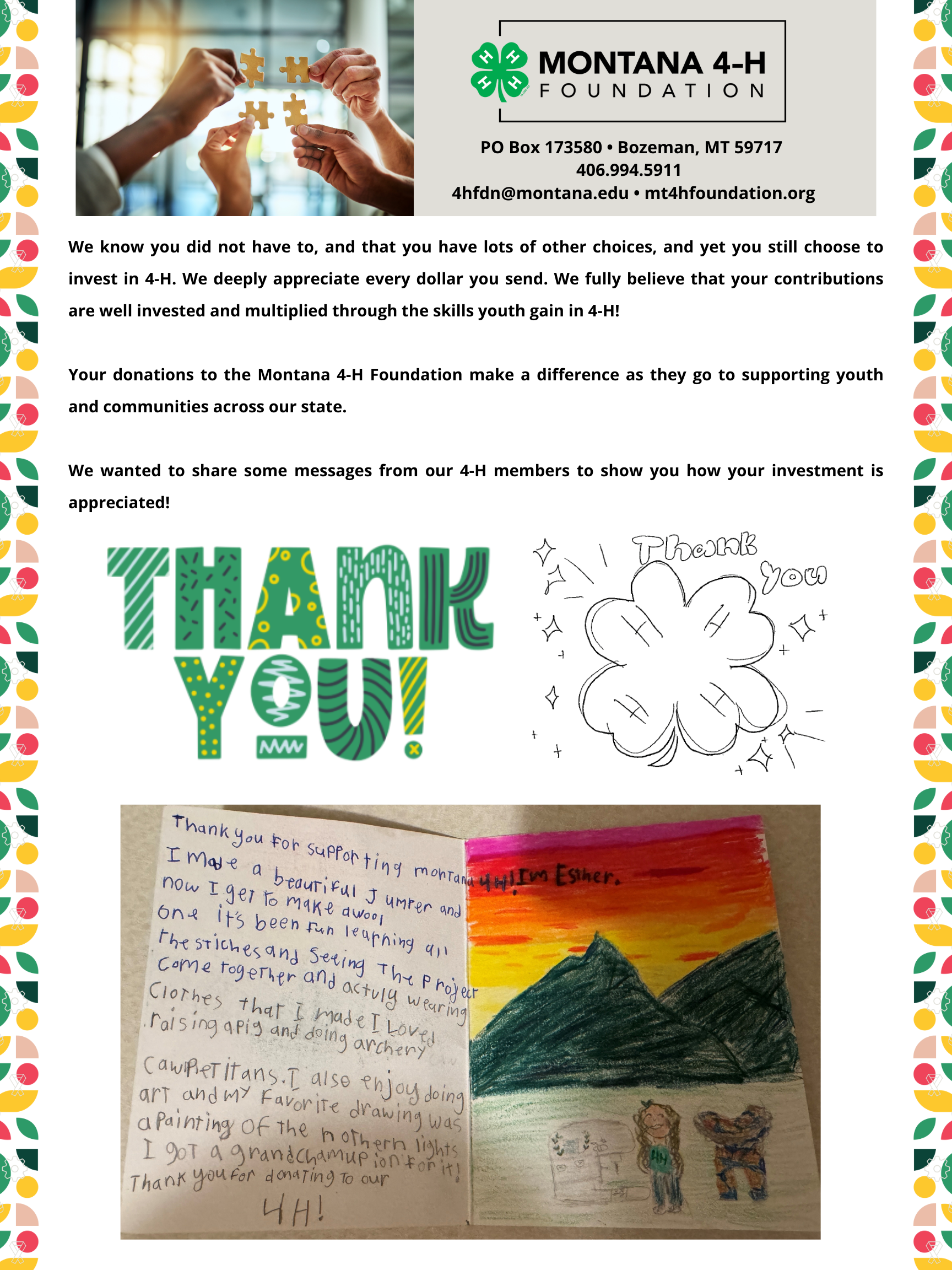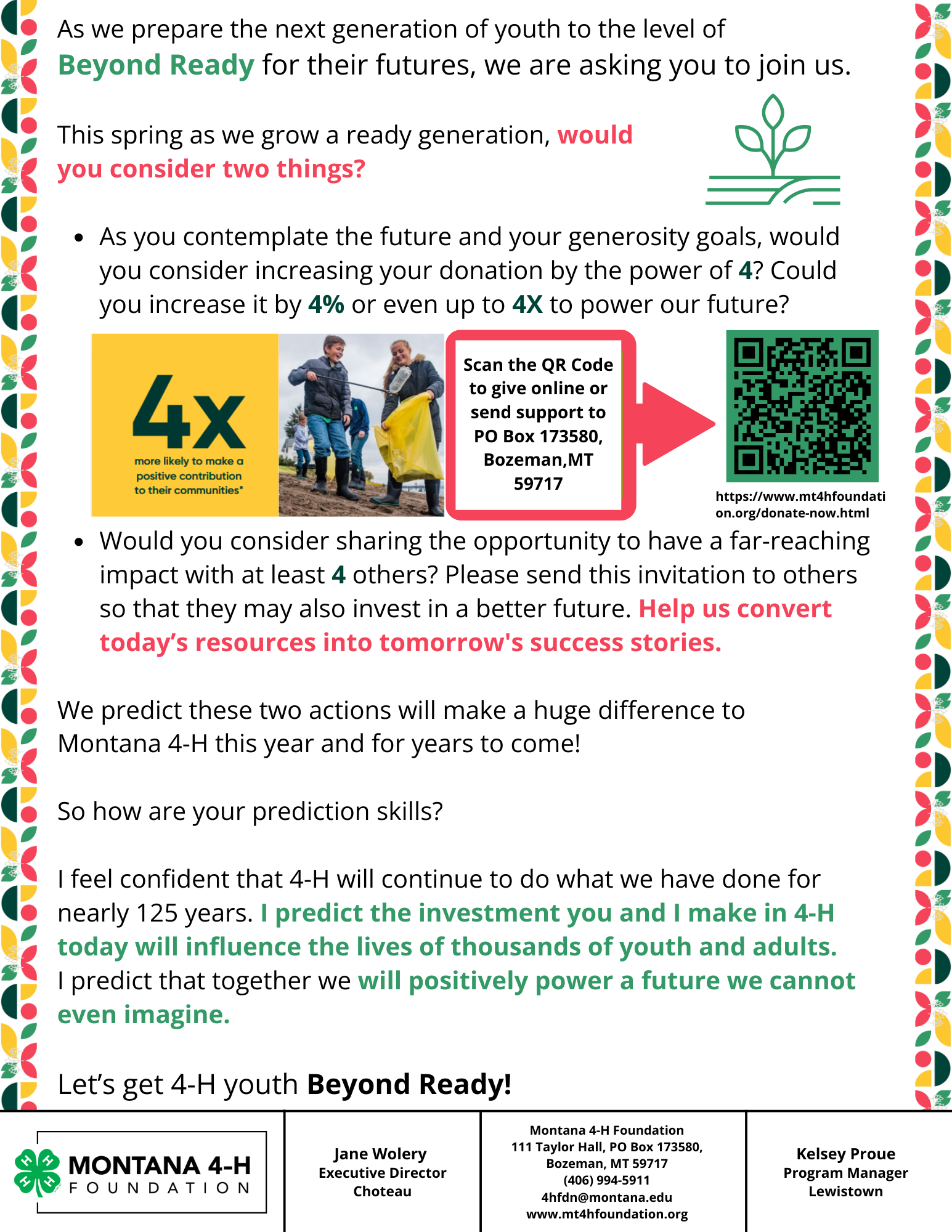 We are so honored that we are part of the protective factors for youth in our state, working to help them be a strong and sustainable crop contributing to and leading their communities for years to come. Thank you to all those who help us with inputs through donations to make sure we can fortify 4-H youth through the Montana 4-H Foundation."