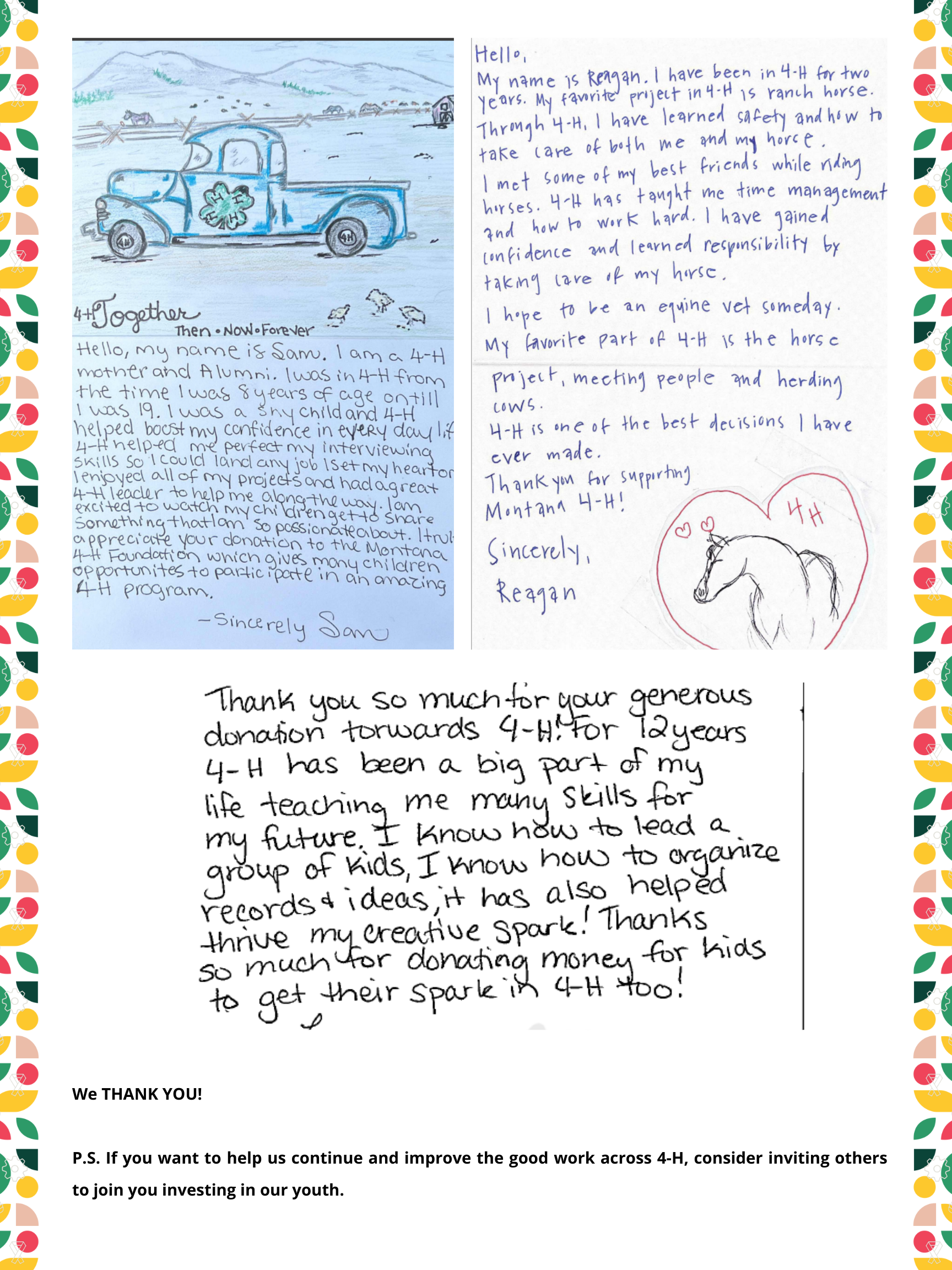 We think of our 4-H youth as the finest and most important crop we have in Montana. 4-H can only exist the way we know it today because of you and your contribution.